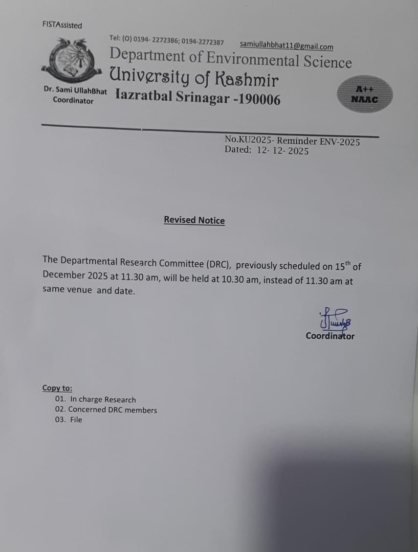 Established in the year 2000, the Department of Environmental Science began offering M.Sc. and Ph.D. programs in 2001 and 2002 respectively, under the leadership of Prof. A.R. Yousuf. Since its inception, the Department has played a pivotal role in delivering high-quality interdisciplinary education, research, consultancy, and outreach. Our faculty comprises young, dynamic, and dedicated professionals committed to academic excellence and guiding both students and research scholars. We are proud of our standing as a distinguished department that fosters an environment of growth, learning, and